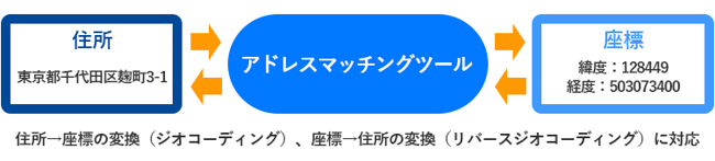 当社のアドレスデータを搭載し、住所文字列に座標を付与(ジオコーディング)したり、座標情報から住所文字列を返す(リバースジオコーディング)コンポーネントです。