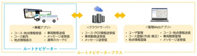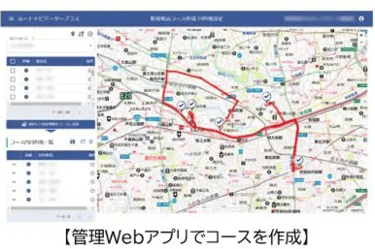 『ルートナビゲータープラス』は、巡回業務を強力にサポートする機能を付加した車載アプリと、事業所側で運用する管理アプリで構成されたシステムです。
