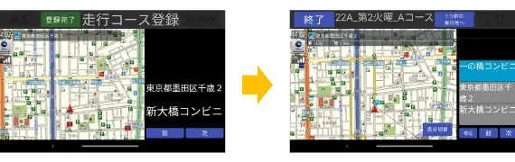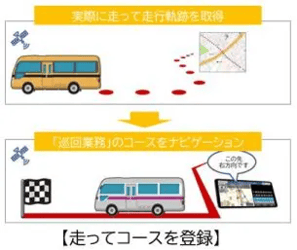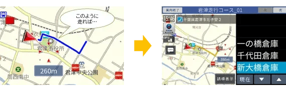 複数の経由地の設定も、ルートの再探索も不要。いつもの巡回ルートを走行して「コース登録」するだけで、途中のルートも「コース案内」で再現、迷うこともなく安心です。
