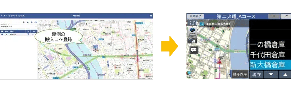 巡回ルートを運行する車両を多数所有されているお客様からの「新人や代理ドライバーでも迷わず走行できるカーナビ機能はそのままに、全体管理もまとめて行いたい」というご要望の声から誕生しました。