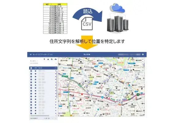 立ち寄り地点をまとめたリストを取り込んで、一括登録。住所文字列さえあれば、適切な地点に配置します!