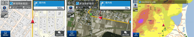 カーナビ上で従来の道路地図以外に航空写真や住宅地図など、上に重ねて他の表示を行いたいというご要望にお応えし、「ラスタータイルデータの重ね合わせ表示機能オプション」を提供しています。様々な情報をカーナビ画面上で確認することで、直感的に情報を確認することができるようになります。