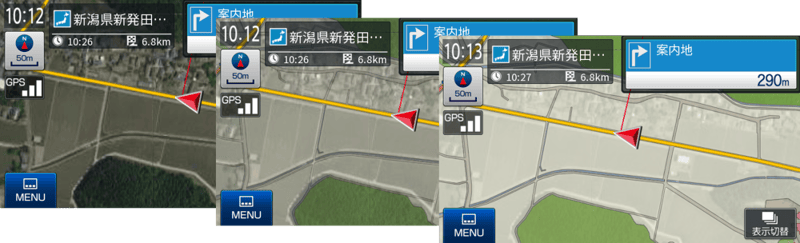 基本仕様は「マップルナビ」と共通になり、スマートフォンのナビとは異なる本格的な案内が表示されます。様々なイラスト、通過予定交差点、交差点の拡大図など、案内ポイントをわかりやすく表示します。