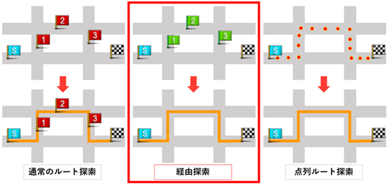 一般のカーナビでは用意されない、業務での利用に適したルート探索機能を用意しています。