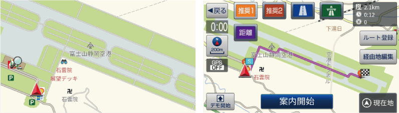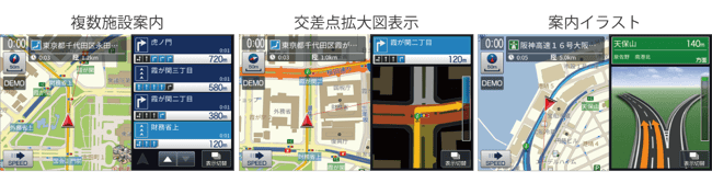 車載用のカーナビと同等のものを搭載しています。先々の案内箇所をあらかじめ確認できる複数施設案内や、右左折箇所を拡大した交差点拡大図および案内イラストなど、わかりやすく誘導情報を表示します。