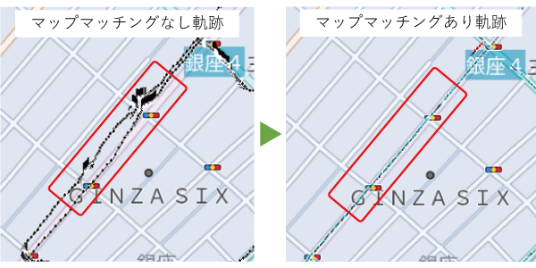 マップマッチングにより自車の走行道路を特定します。マップマッチングした位置情報を軌跡として表示した場合は、表示する自車位置はGPSの測位位置をそのまま利用するのではなく、より道路上に位置を補正して表示します。