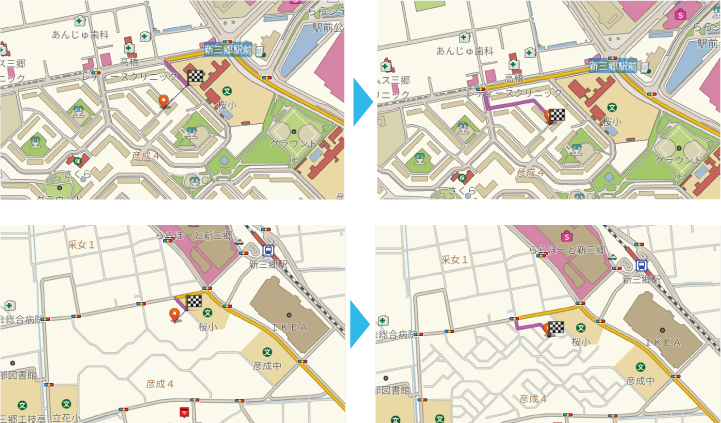 緯度経度の点列として入力しますので、外部システムで出力された結果などを利用するのに最適です。設備点検で区域内を回ったり、決められた道を通らなくてはいけない場合等のルート案内にお役立ていただけます。
