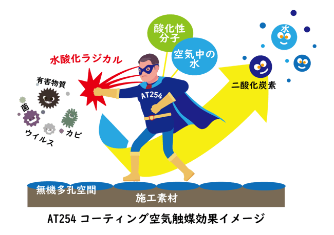 • 安全性の証明された高性能防カビ剤を無機オリゴマーに分散させた抗菌・防カビ剤「AT254」は、A型インフルエンザウイルスに対して抗ウイルス効果が認められ、254種類の細菌やカビ菌等に対して抑制作用あり。